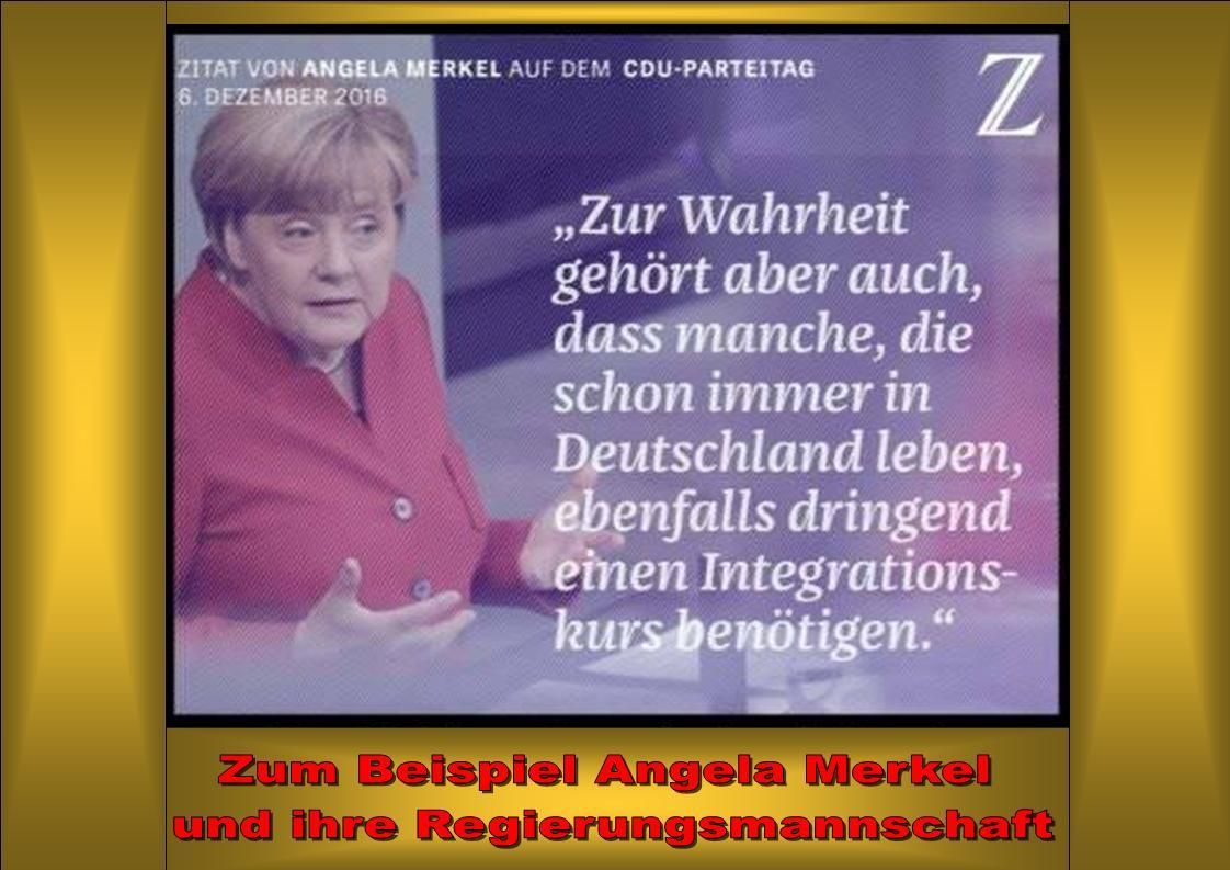 In was also soll man sich laut Merkels Forderung denn integrieren, ausser in ihre Merkelkratie, denn ein Deutschland als Deutschland mit deutschen Werten und deutschem Volk gibt es laut ihrer Politik nicht. Folglich dessen geht es ihr auch nicht um eine Integration in Deutschland, sondern um eine Integration in die von ihr gestaltete Global-Politik voller schlammiger und schwammiger Werte, um für das System und die herrschende Klasse problemlos zu funktionieren. (um für die jüdische, zionistische Weltherrschaft problemlos zu funktionieren.)